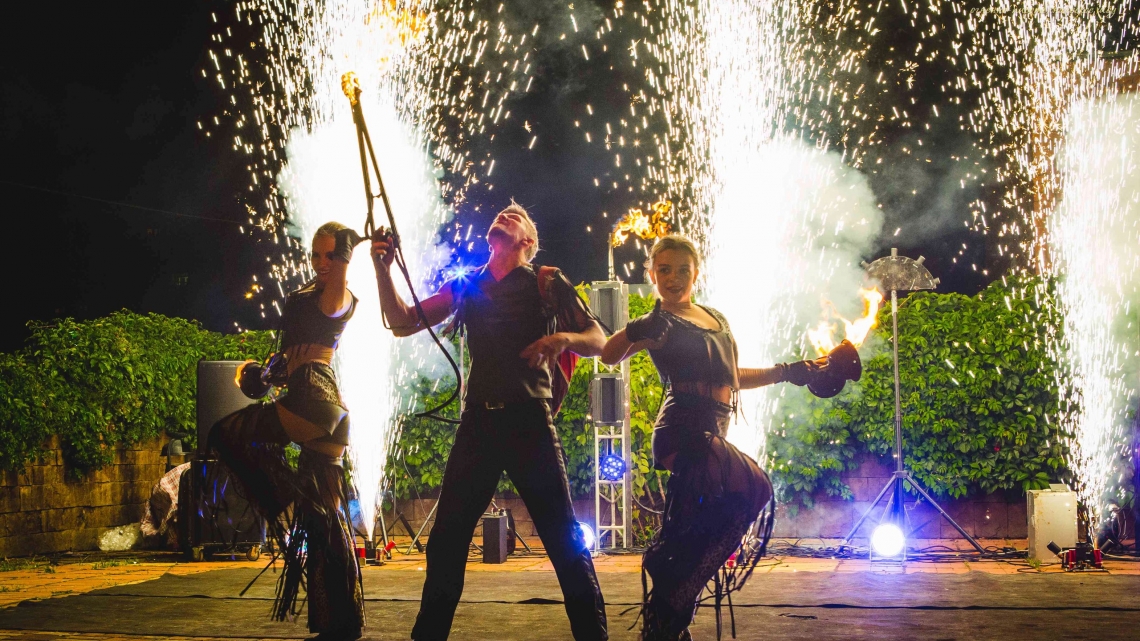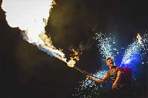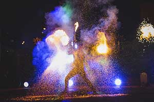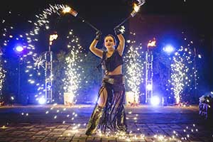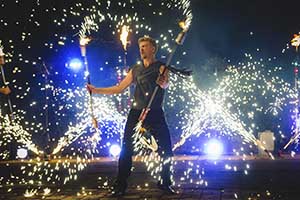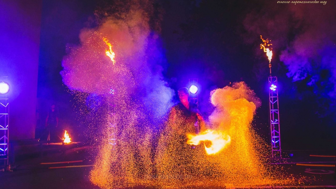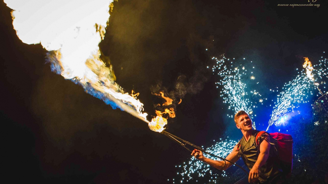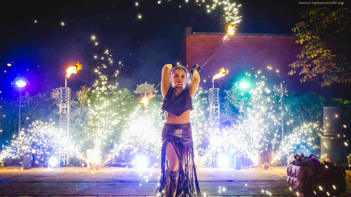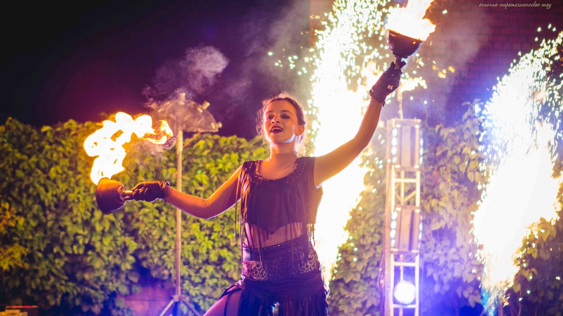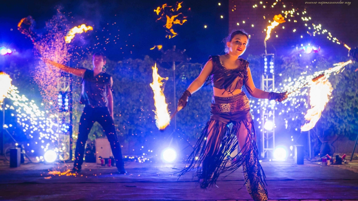 Рекомендуем: фаер шоу для выпускных, корпоративов, юбилеев, семейных праздников, больших торжеств. Для свадьбы можно дополнить нашу программу пиротехнической надписью, салютом в конце шоу.